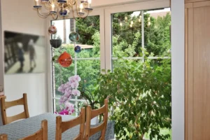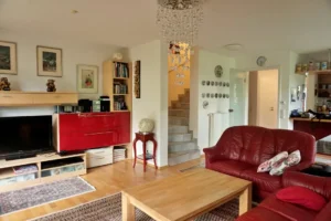 Der großzügige, offene Wohnbereich verbindet harmonisch das Wohnen, Essen und Kochen. Drei doppelt verglaste Fenster fluten den Raum mit Tageslicht, was eine strahlende und einladende Atmosphäre schafft. Die gepflegte Einbauküche, die geschickt als halbhohe Raumtrennung integriert ist, betont die elegante Verbindung von Funktionalität und Ästhetik.