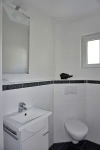 - WC mit Waschbecken – exklusivem Granitboden und gefliesten Wänden